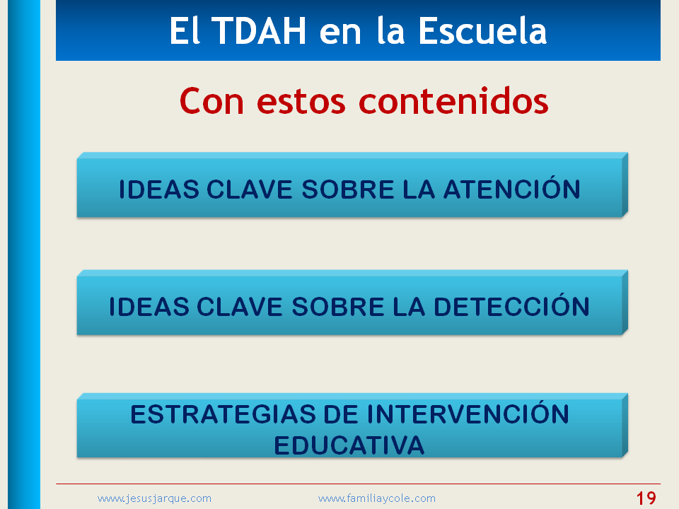 Se abordarán tres bloques de contenido principales: Ideas clave sobre la atención; ideas clave sobre la detección y un tercer bloque dedicado a estrategias de intervención educativa en el colegio.