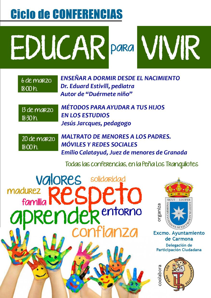El próximo viernes, 13 de marzo voy a impartir una charla coloquio titulada Métodos para ayudar a tus hijos en los estudios. Está organizada por el Excmo. Ayuntamiento de Carmona, en la provincia de Sevilla, y forma parte de un ciclo de conferencias tituladas Educar Para Vivir, en la que participan el Dr. Eduard Estivill o el Juez de Menores, Emilio Calatayud.