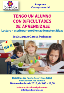 El próximo 10 de noviembre impartiré en Tenerife, en el Puerto de la Cruz, el curso «Tengo un alumno con Dificultades de Aprendizaje: Lectura, Conciencia Fonológica, Escritura, Ortografía y Problemas Matemáticos«.