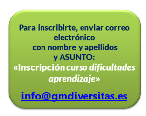 Para inscribirte debes enviar un correo electrónico con tu nombre y dos apellidos con el asunto «Inscripción curso Dificultades Aprendizaje». Debes enviarlo a la siguiente dirección: info@gmdiversitas.es
