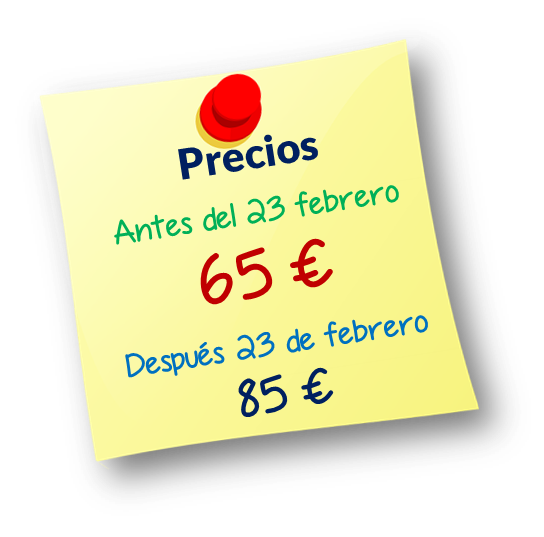 - El precio del curso son 65 euros, si realizas la inscripción antes del 23 de febrero. Y si lo haces después de esa fecha el precio será de 85 euros