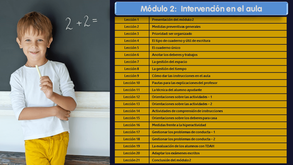 Se trata de un curso exclusivamente centrado en la intervención educativa en el TDAH: intevención en el colegio, en el aula, en la familia e intervención individual.