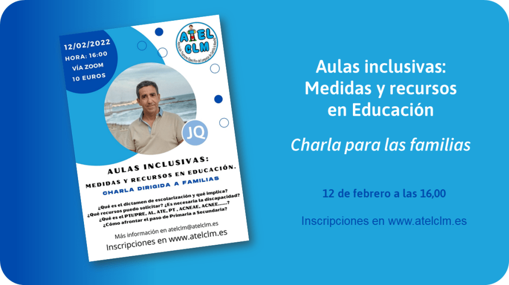 El próximo sábado 12 de febrero de 2022 voy a participar en una charla sobre las medidas de inclusión en la escuela. Ha sido una iniciativa de la Asociación Trastorno Específico del Lenguaje de Castilla-La Mancha, ATEL-CLM, ahora que ha comenzado el periodo de admisión de alumnos en algunas comunidades autónomas.