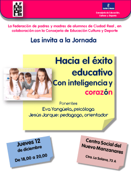 El próximo jueves se celebra en Manzanares, Ciudad Real, una nueva jornada para las familias y profesionales sobre el éxito educativo y la prevención del absentismo y fracaso escolar. En este caso lleva por título «Hacia el éxito educativo: con inteligencia y corazón«. En esta entrada les ofrezco toda la información.