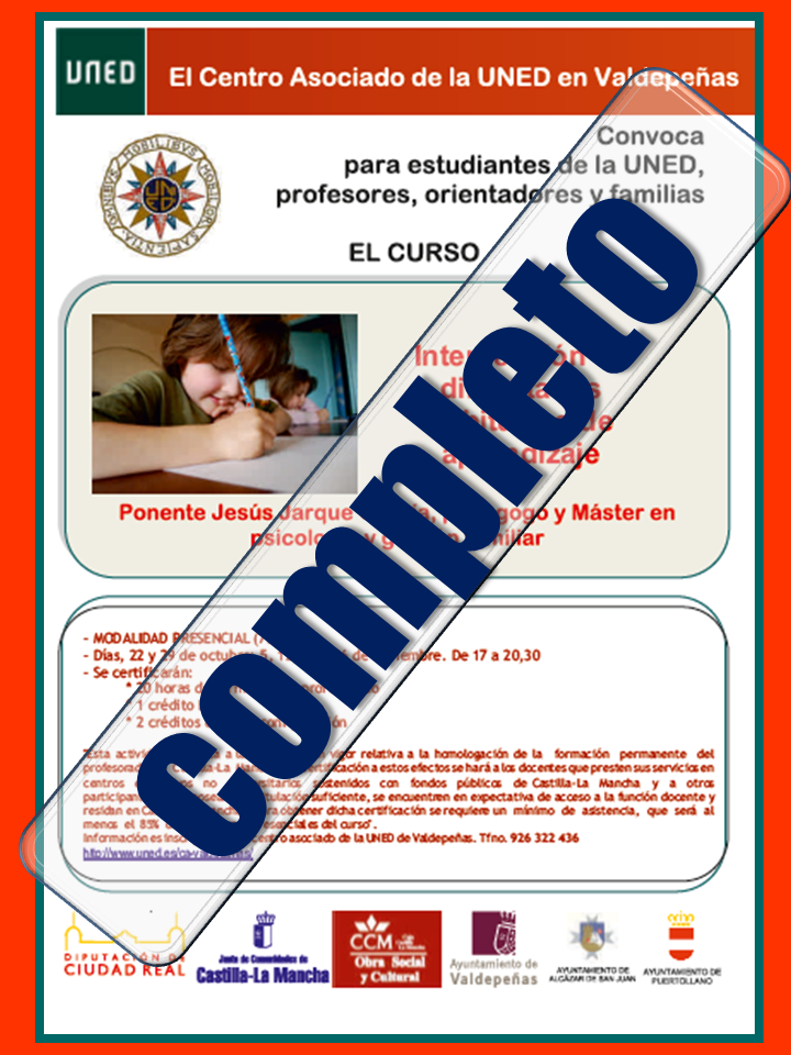 El próximo 22 de octubre de 2012, comenzaré a impartir en la UNED, en el centro asociado de Valdepeñas (Ciudad Real) un curso de 20 horas titulado «Intervención en las dificultades habituales de aprendizaje». Hasta el 19 de octubre está abierto el plazo de inscripción. En esta entrada les doy todos los datos sobre el curso. Seguir leyendo